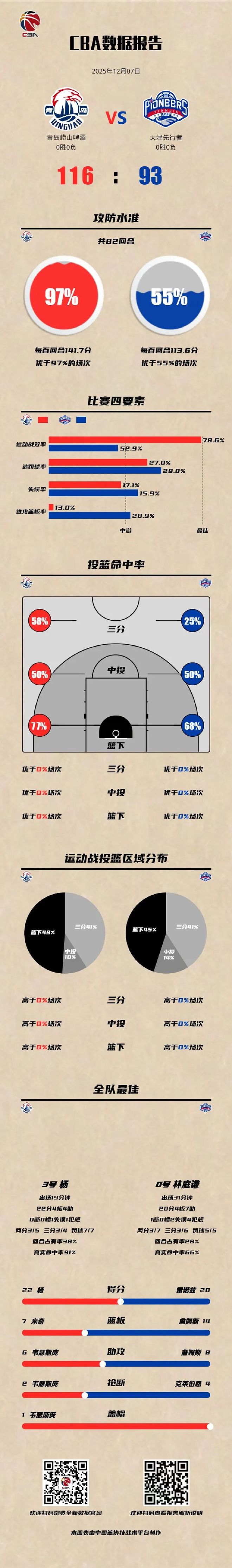 北京时间2025年12月7日,第二届中国人寿·CBA俱乐部杯小组赛继续,青岛崂山啤酒迎战天津先行者。球队整体发挥出色,开局建立领先优势并保持到最后,五人得分上双,最终116-93战胜对手。