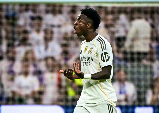 雷速体育11月2日讯 在今日凌晨皇马4-0大胜瓦伦西亚的比赛中,上半场第43分钟,A费禁区内倒地造点,维尼修斯向队内头号点球主罚手姆巴佩手中要走了皮球,随后主罚点球被瓦伦西亚门将阿吉雷扎巴拉扑出。
